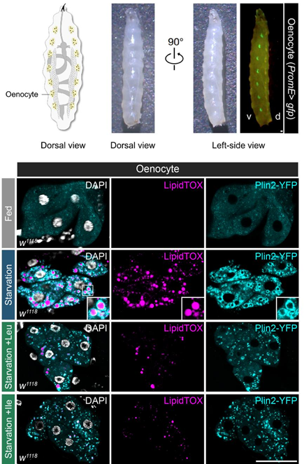 “当我们感到迷茫,果蝇总能指引我们前进的方向。”正如2017年诺贝尔生理学或医学奖获得者迈克尔·杨(Michael Young)所说,“是果蝇让我们一次又一次踏上正确的道路。纵使演化的巨轮滚滚向前,我们依然能够从果蝇身上捕捉到哺乳动物乃至人类的影子。”全基因组测序结果表明,黑腹果蝇(Drosophila melanogaster)与人类基因组的同源程度高达60%,涵盖77%的人类遗传病致病基因,是理想的疾病模型【5】。果蝇幼虫绛色细胞(oenocyte)与人类的肝细胞高度类似,在饥饿刺激下也会积累大量的脂滴,模拟了人类的脂肪肝病【6】,为理解营养不良造成脂肪肝病的临床表现提供了理想的切入点。正是基于上述同源特性,以及果蝇遗传学的强大优势,绛色细胞为营养不良造成脂肪肝病的分子机制研究提供了理想的研究系统。那么,我们能否利用果蝇研究肝细胞的饥饿响应机制,回答为什么营养不良会导致脂肪肝病这个问题呢?