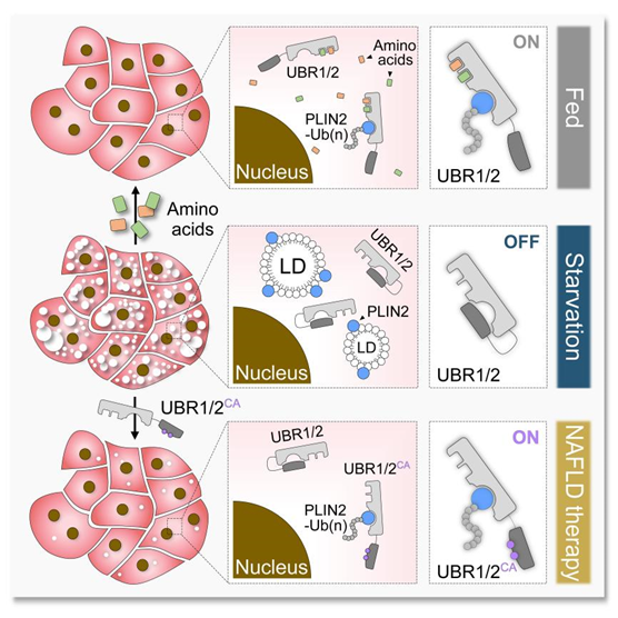 作为目前世界范围内发病率最高的慢性肝病,脂肪肝病严重威胁着人类的生命健康。尽管耗费了大量的人力物力财力,目前仍然没有任何一款脂肪肝病的治疗药物获批上市。那么,是否能够通过激活 Ubr1 实现脂肪肝病的治疗呢?朱健课题组发现,必需氨基酸对 Ubr1 的激活依赖于其自抑制作用的解除。通过解除 Ubr1 的自抑制作用,他们构建了持续激活形式的 Ubr1 突变体。在没有氨基酸结合的情况下,持续激活形式的 Ubr1 突变体也能够高效地催化 Plin2 的泛素化降解,显著改善因氨基酸摄入不足造成的脂肪肝病。值得一提的是,通过对分离内含肽(split-intein)技术的改进,他们在小鼠肝脏中实现了持续激活形式的 Ubr1 突变体蛋白的重组表达。在2周时间内,持续激活形式 Ubr1 突变体的表达能够显著改善肥胖或高脂饮食导致的脂肪肝病,促使小鼠肝脏脂肪含量减少40%以上。因此,激活 Ubr1 可以作为脂肪肝病潜在的治疗策略,能够特异性结合并激活 Ubr1 的脂溶性小分子有望成为治疗脂肪肝病的特效药。