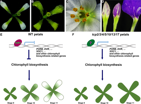 (A) 野生型拟南芥花瓣具有基部为绿色,顶部为白色的颜色分布模式。(B) 七重突变体tcp2/3/4/5/10/13/17花瓣的颜色均为绿色。(C) 圣心百合的花瓣也具有基部为绿色,顶部为白色的颜色分布模式。(D) 紫色的二月蓝花瓣基部也为绿色,顶部先转白再转紫。(E和F) TCP转录因子抑制绿色花瓣形成的工作模型。在野生型花瓣中,TCP4通过直接结合下游基因PORB、DVR和SOC1的启动子区,抑制其表达,从而抑制叶绿素在花瓣顶部的合成和积累,导致花瓣变成白色 (E),而在 tcp2/3/4/5/10/13/17突变体中,TCP转录因子功能的缺失使叶绿素合成相关基因能在花瓣顶部组织中维持表达,使叶绿素在花瓣顶部组织合成和积累,导致花瓣变成绿色 (B)。