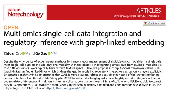 针对上述挑战,2022年5月2日,PA视讯游戏平台官网高歌课题组于Nature Biotechnology发表题为“Multi-omics single-cell data integration and regulatory inference with graph-linked embedding”的研究论文,提出了基于图耦联策略的深度学习方法GLUE,首次实现了对百万级单细胞多组学数据的无监督精准整合与调控推断。