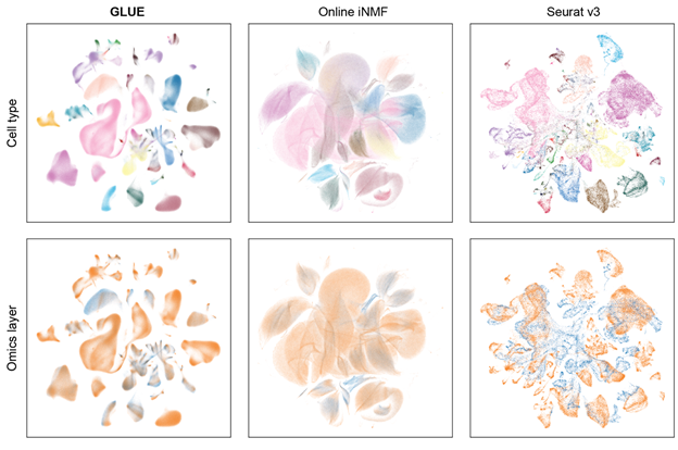 图2 GLUE首次实现了图谱级超大规模单细胞多组学数据的准确整合。与同类工具相比,GLUE在细胞分辨率与叠合精度方面均具有显著的优势。