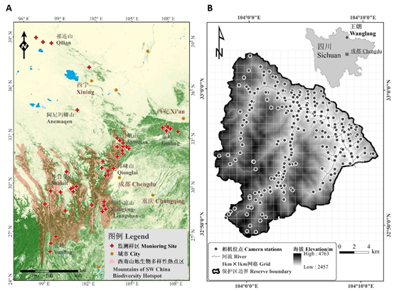 A. 监测样区分布;B. 典型样区内红外相机布设网格(以四川王朗保护区为例)