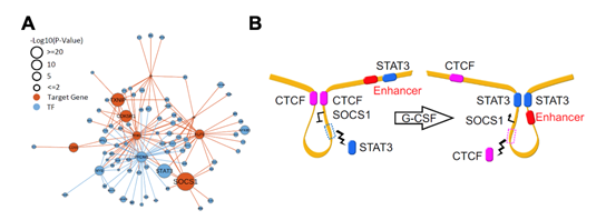 通过整合RNA-seq,ATAC-seq及Hi-C的多组学数据分析,研究人员发现SOCS1是G-CSF动员后表达水平上调最为显著的基因,而转录因子STAT3可能是直接调控SOCS1表达的上游因子(图2A)。进一步整合分析原代T细胞中增强子信号(H3K27ac)以及STAT3的染色质结合(CUT&Tag)数据发现,G-CSF可能通过重构SOCS1基因编码区的染色质三维结构上调SOCS1表达水平。在G-CSF动员后的T细胞中SOCS1的基因编码区附近,STAT3的结合重构染色质环,促使SOCS1启动子区域与上游的增强子区域互作加强,而由CTCF介导的SOCS1启动子区域与下游的异染色质区域互作水平降低,从而上调了SOSC1的表达水平(图2B)。