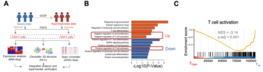 2022年5月18日,PA视讯游戏平台官网黄晓军、李程、常英军合作,在《Advanced Science》期刊发表了 “Multiomics Analysis Identifies SOCS1 as Restraining T Cell Activation and Preventing Graft-Versus-Host Disease”的研究论文。在本项研究中,研究人员利用多组学测序手段RNA-seq,ATAC-seq,Hi-C等技术,分析了G-CSF动员前、后健康供者骨髓来源的CD3+CD4+和CD3+CD8+ T细胞的转录组、染色质开放性及三维基因组结构变化(图1A)。多组学分析提示,G-CSF动员后的T细胞中正向调控T细胞相关活化基因的表达水平下调,负向调控T细胞增殖及活化相关信号通路表达上调(图1B)。ATAC-seq分析也表明,T细胞活化相关基因所在染色质区域在G-CSF动员后的T细胞中染色质开放性下降(图1C)。