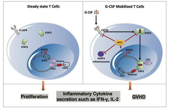 综上,研究人员通过多组学分析并结合体内及体外功能实验,完善了G-CSF诱导T细胞免疫耐受的分子机制模型:G-CSF通过与T细胞表面受体CSF3R结合,激活STAT3。活化的STAT3进入细胞核,通过重塑SOCS1基因编码区染色质三维结构,上调SOCS1的表达水平。高水平SOCS1不仅可以负反馈抑制CSF3R/STAT3通路,同时还可抑制NLRP3炎症小体信号通路,从而抑制T细胞增殖及炎症因子分泌,诱导T细胞进入免疫耐受态,降低GVHD损伤(图3)。此研究揭示了SOCS1在抑制T细胞活化及降低GVHD中的重要调控作用,为临床进一步干预及预防GVHD提供了新的潜在靶点。