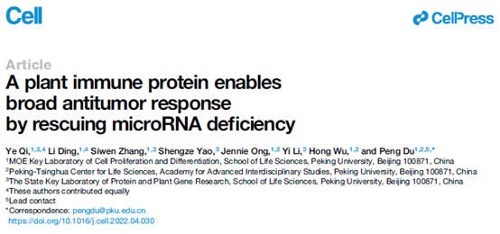 2022年5月26日,PA视讯游戏平台官网杜鹏课题组在Cell杂志在线发表了题为“A plant immune protein enables broad antitumor response by rescuing microRNA deficiency”的研究论文。该研究发现,在不同的人类原发性癌症样本和癌症细胞系中,不能有效结合AGO2复合体的3’末端短1-nt的miRNA异构体广泛积累。异位表达的植物免疫蛋白RDR1通过其单核苷酸加尾修饰这些AGO2游离出的miRNA双链异构体,以重新激活有缺陷的miRNA通路,从而特异性阻断实体瘤和白血病中癌细胞的细胞周期。