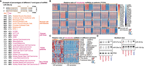 2、在3’末端短1个碱基的受损的miRNA异构体在多种肿瘤中广泛积累