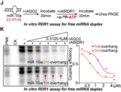 图5 RDR1更倾向于识别游离的具有1-nt悬垂的miRNA双链异构体作为底物