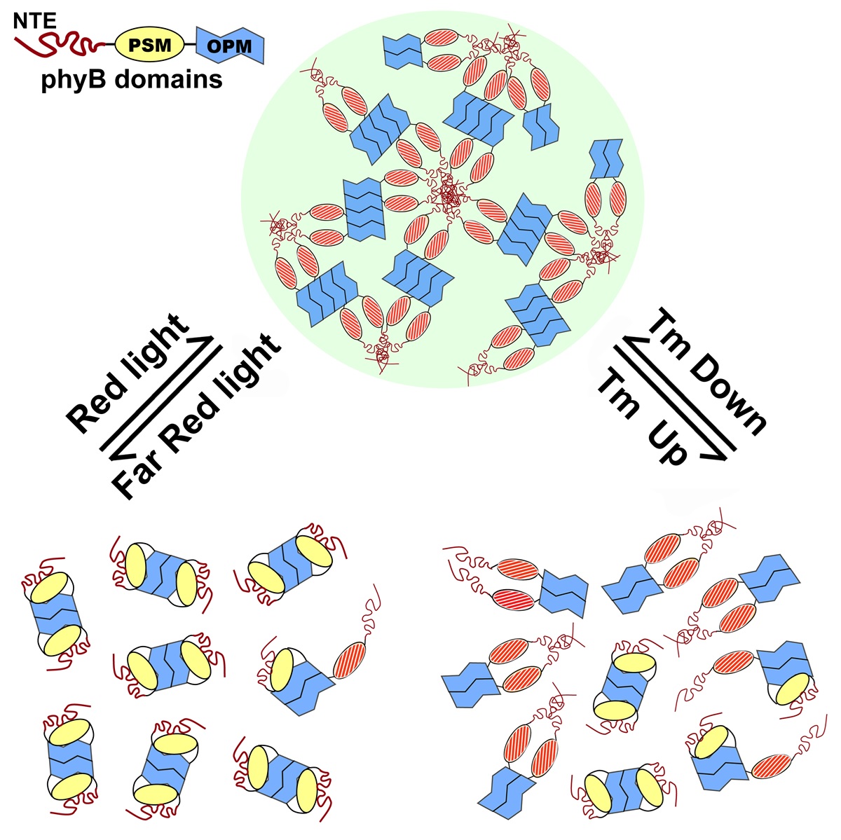 图1 phyB通过可逆构象转变与液液相分离,同时感知光照与温度信号。