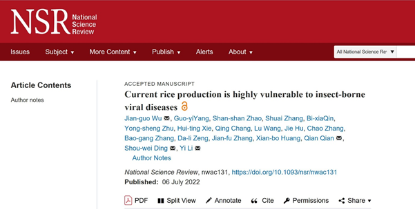 Jian-guo Wu, Guo-yi Yang, Shan-shan Zhao, Shuai Zhang, Bi-xia Qin, Yong-sheng Zhu, Hui-ting Xie, Qing Chang, Lu Wang, Jie Hu, Chao Zhang, Bao-gang Zhang, Da-li Zeng, Jian-fu Zhang, Xian-bo Huang, Qian Qian, Shou-wei Ding, Yi Li. Current rice production is highly vulnerable to insect-borne viral diseases, National Science Review, 2022. https://doi.org/10.1093/nsr/nwac131.