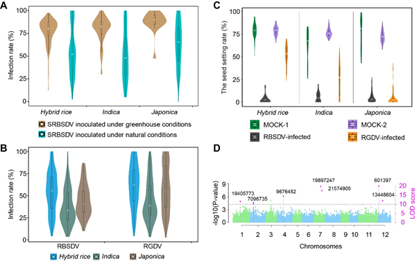 南方水稻黑条矮缩病毒(SRBSDV),水稻黑条矮缩病毒(RBSDV)和水稻瘤矮病毒(RGDV)常年在亚洲多个地区发生。为了研究我国重要的水稻种质对近年来流行的水稻病毒的抗性,课题组首先对136份水稻种质在温室进行人工接种SRBSDV,发现绝大多数水稻种质对该病毒高度敏感。表明我国常见的水稻种质可能对SRBSDV均不具备抗性。为了进一步确定这一结果,课题组与福建农科院谢华安院士等课题组合作,共收集了528份重要的水稻种质,涵盖了我国推广面积最大的杂交稻、应用面积最大的常规稻以及配组组合最多的不育系和恢复系等,并对528份水稻种质连续6年分别在广西南宁和桂林进行田间抗病毒鉴定,发现至少有25%的水稻种质发病率高达80%以上。在2016至2021年间,课题组在河南开封和福建云霄两地对528份水稻种质分别进行了RBSDV和RGDV的田间水稻抗病毒鉴定实验,发现所有的水稻种质均可被RBSDV和RGDV侵染。为了进一步探究水稻病毒对水稻生产造成的危害,作者随机选取20个水稻种质,并统计了RBSDV和SRBSDV对水稻结实率的影响,结果显示这两种水稻病毒的侵染严重的影响了水稻的结实率。这些结果表明目前培育的水稻种质对水稻病毒均不具有广谱抗性,一旦这些水稻病毒爆发,将会造成水稻严重减产,影响粮食安全。作者还利用GWAS,对528份水稻在广西南宁和桂林的田间数据进行QTNs抗病毒相关位点分析,在1,2,4,7和12号染色体上共发现了7个与水稻耐病高度相关的QTNs位点,这为进一步揭示水稻抗病毒遗传机制提供了可能性。