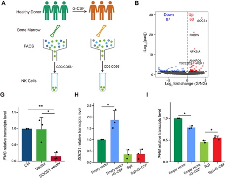 为了揭示G-CSF抑制NK细胞分泌IFN-γ的分子机制,研究者首先对G-CSF动员前、后健康供者骨髓来源的NK细胞进行了转录组RNA-seq分析,发现SOCS1是G-CSF作用后表达水平上调最显著的基因。随后,在NK细胞系(NK92)中进行的SOCS1过表达和敲除实验证明了SOCS1表达上调可以有效抑制NK细胞分泌IFN-γ,而敲除SOCS1可以逆转G-CSF对NK细胞分泌IFN-γ的抑制作用(图1)。因此,G-CSF抑制NK细胞分泌IFN-γ与SOCS1表达水平上调有关。