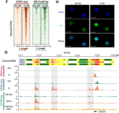 接着,通过对G-CSF动员前、后的NK细胞进行转录因子结合Cut&Tag实验和成像验证,研究者证明了G-CSF促进GR的转录与入核,且G-CSF动员后染色质开放性增强的区域伴随着GR结合水平的增加。其中,SOCS1附近的两个增强子在G-CSF动员后也呈现出GR结合水平的增加(图3)。因此,G-CSF上调SOCS1的表达可能与GR有关。