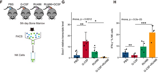 为了进一步证实G-CSF通过激活GR进而上调SOCS1的转录,研究者在小鼠中进行G-CSF动员实验,同时设置GR拮抗剂(RU486)组以抑制G-CSF动员后GR的调控作用。研究者发现遏制GR作用后可以有效逆转G-CSF上调SOCS1的转录及抑制IFN-γ分泌(图4)。