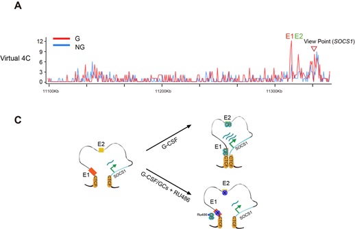 最后,为了揭示GR上调SOCS1表达的调控机制,研究者对G-CSF动员前、后的NK细胞进行了三维基因组Hi-C实验和分析。研究者发现G-CSF作用后SOCS1与其上游两个增强子(E1,E2)的相互作用频率显著增加,因此提出了调控机制模型:G-CSF促进GR入核并结合在SOCS1增强子上,进而增强SOCS1启动子与增强子的调控作用,最终促进SOCS1转录和上调(图5)。
