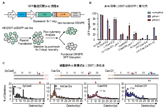 A. 不同CRISPR-Cas系统在HEK293T-d2EGFP细胞系的编辑效率检测流程图。B. 在指定靶位点不同Cas酶的GFP基因破坏效率。C. 不同CRISPR-Cas系统编辑产生的碱基缺失长度的模式图。