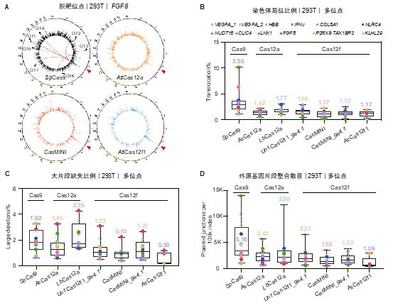 A. 不同编辑工具在FGF18位点所产生的脱靶位点的数目与分布。B-D. 不同Cas酶在基因编辑中所产生的染色体易位事件(B),染色体大片段缺失(C),外源DNA片段插入(D)的比例。