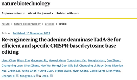 2022年11月11日,PA视讯游戏平台官网伊成器课题组和合作者联合在Nature Biotechnology杂志上在线发表了题为“Re-engineering the adenine deaminase TadA-8e for efficient and specific CRISPR-based cytosine base editing”的研究成果。该项研究通过在TadA-8e腺嘌呤脱氨酶中引入N46L突变,成功将其转变为专一且高效的胞嘧啶脱氨酶,并以此为基础开发了新型的碱基编辑器Td-CGBE与Td-CBEs。