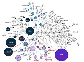 在S/L谱系划分基础上,陆剑团队与吕雪梅等课题组合作,进一步构建新冠病毒分层次谱系划分系统,揭示新冠病毒进化轨迹。研究团队分析了121,618个高质量的病毒基因组中的单核苷酸变异(SNV),根据3个主导性SNV将L谱系划分为L1和L2两个主要亚谱系,再根据位点的突变频率和连锁性筛选出201个代表性SNV,进一步逐级划分出130个亚谱系,绘制了反映各个谱系之间亲缘关系的单倍型网络图(图2),并建立了实时更新的配套网站(www.covid19evolution.net)方便查看亚谱系信息。该研究囊括了目前出现的绝大多数新冠基因组变异并整理了它们的谱系关系,阐明其中各个谱系时空分布的规律,搭建出新冠病毒演化的大体框架,为理解病原体变异规律和预测病毒的演化方向提供参考。该工作于2021年在Science Bulletin发表后,获该期刊年度“十大下载论文奖”(“Science Bulletin2021 Top 10 Downloaded Paper Award”)。