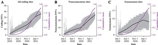 为了进一步揭示新冠病毒流行株背后的进化推动力,陆剑团队与中山大学吴仲义团队合作,开展群体遗传模拟和大数据分析。模型分析表明,随着新冠疫情的不断扩散,病毒群体大小会随着感染人数的增加而变大,群体大小的扩大则会提高适应性变异出现和固定的概率,而加速的适应性进化速率反过来会加快病毒的扩散进而导致病毒群体的进一步增大,如此便会形成群体大小和进化速率之间的正反馈循环,最终导致病毒的失控演化(图4)。研究表明,随着新冠病毒感染人数的不断增加,新冠病毒于2020年底开始进入加速进化的阶段,导致高度进化的病毒株的快速涌现(Ruanet al., 2022,Molecular Biology and Evolution)。