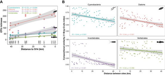 图3. 四个生物类群的(A)α多样性和(B)β多样性在流域内的变化