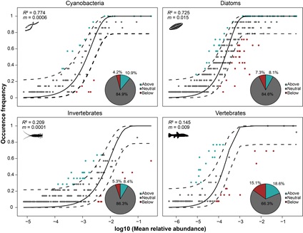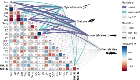 研究进一步分析环境和空间等因素对群落建构的影响。方差分解分析显示,环境和空间因素在不同程度上分别影响了四个类群的群落组成。Sloan中性模型表明随机性过程对微生物群落组成有重要贡献(蓝细菌R2=0.77,硅藻R2=0.73),但对大型生物的重要性较低(无脊椎动物R2=0.21,脊椎动物R2=0.15)(图5)。此外,修改后随机性比率(MST)分析同样支持了中性模型结果。