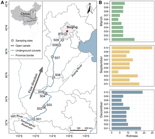 2023年1月7日,PA视讯游戏平台官网和生态研究中心姚蒙课题组在国际重要环境科学期刊Journal of Environmental Management发表了题为“To the north: eDNA tracing of the seasonal and spatial dynamics of fish assemblages along the world's largest water diversion project”的研究论文。本研究以南水北调中线的鱼类为研究对象,在春、秋、冬三季对南起湖北丹江口水库、北至北京的总长度1,277公里的干渠进行了eDNA鱼类多样性分析(图2A),获得了南水北调中线鱼类多样性和群落组成的时空分布数据,并探究了可能影响鱼类跨流域运输的功能形状特征。