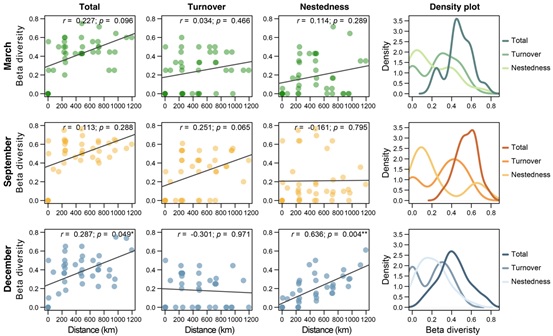 图3. 不同季节鱼类群落整体beta多样性及转换、嵌套组分与距离相关性分析