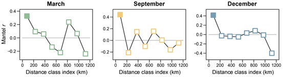 图4. 不同季节基于鱼类群落beta多样性的空间自相关分析