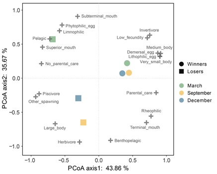 图5. 中线干渠中潜在存活(Winners)和死亡(Losers)鱼类物种的功能性状分析