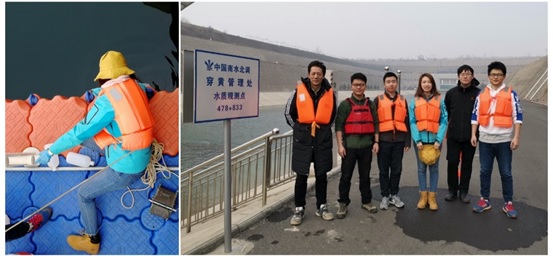 论文第一作者张姗在采集南水北调水样品(左);采样人员合影(右)