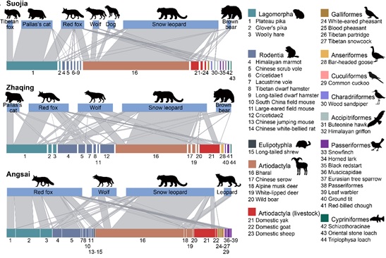 食物网描述了一种物种相互作用的最重要形式,即物种间直接或间接的取食关系,它决定了生态系统能量流动和物质循环的模式,解析食物网关系对理解物种共存关系和生态系统过程具有重要意义。以往对多种食肉动物共存的复杂群落食物网研究多集中于热带生态系统,对高寒高海拔系统缺乏了解;而基于直接观察和粪便内容物镜检法获得的食性数据物种分辨度和准确性低,难以构建精准定量食物网。