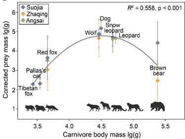 定量食物网分析结果显示,中小型食肉动物主要取食兔形目和啮齿目动物,大型食肉动物主要取食偶蹄目动物(图2)。食肉动物的食性多样性与自身体重无显著相关性,大型和中小型食肉动物中均存在食性专一性较高的专性捕食者和食性广泛的兼性捕食者。此外,食肉动物体重与其猎物体重呈单峰型关系,即大型比中小型食肉动物的猎物体型更大,而集群捕猎的狼、狗捕获的猎物达到峰值(图3)。大型和中小型食肉动物共位群(guild)间以及共位群内存在明显的种间食性组成差异,并且共位群间的食性相似度和生态位重叠程度显著低于共位群内。因此,不同食肉动物物种通过在猎物多样性、体型大小和利用比例上的差异产生物种间营养生态位的分化,可能有助于食肉动物在青藏高原的严酷环境中共存。