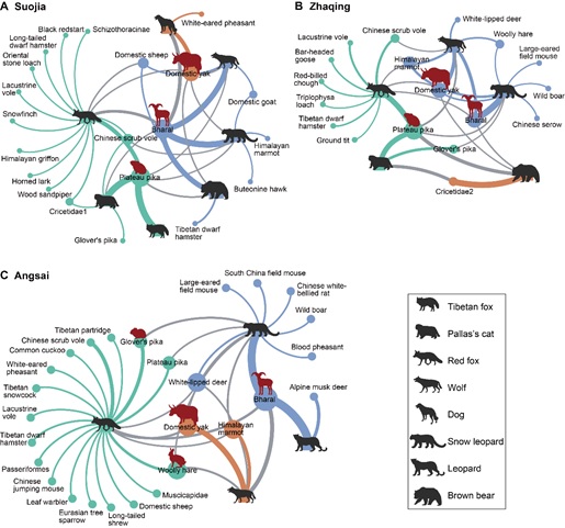 综上,该研究首次详细描述了青藏高原多个食肉动物群落的营养网络结构,并证明了结合分子食性方法和生态网络分析有助于深入阐释食肉动物的共存机制和动物群落的组织格局,并可以识别复杂群落中的重要功能物种。上述研究结果将促进科学保护和管理青藏高原食肉动物群落的完整性,并预测未来生态系统环境变化和人为活动对高原生态系统的影响。