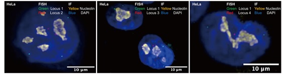 为了验证nHi-C能够富集核仁相关染色质互作,研究者在HeLa细胞中分别进行了in situ Hi-C和nHi-C实验。通过将nHi-C和in situ Hi-C的结果进行比较(图2),并结合FISH成像验证(图3),证明了nHi-C捕获的互作更加富集分布于核仁周围的染色质区域。