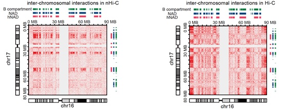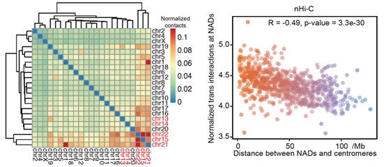 图5 (左)不同染色体之间的trans互作水平;(右)核仁周围染色质区域(NADs)的trans互作水平和它们与着丝粒的距离相关