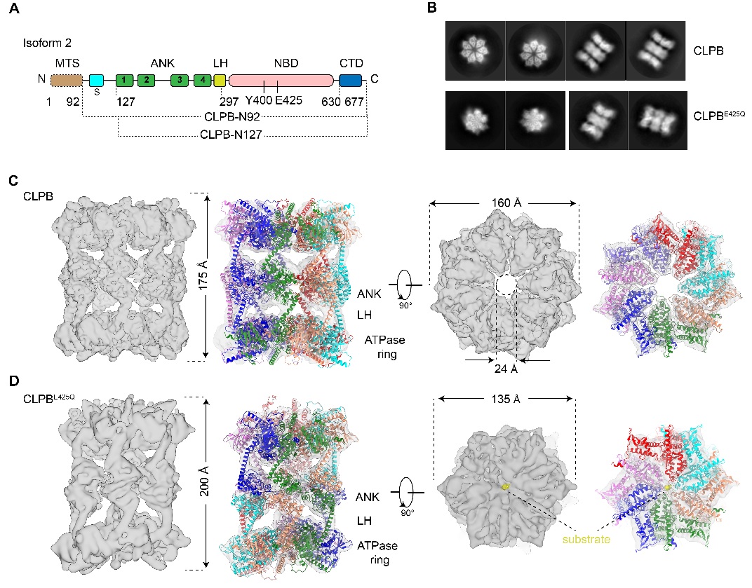 综上,本项工作利用冷冻电镜结合生化、质谱等手段,对CLPB的结构和功能进行了系统性的研究,为理解CLPB在线粒体中发挥去聚集酶活性的分子机理提供了重要的理论基础,为后续设计CLPB的抑制剂来治疗相关疾病提供了重要的结构基础。