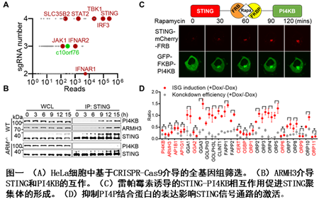 本工作首先通过CRISPR-Cas9介导的全基因组筛选在HeLa细胞系中鉴定到一个未知功能的新基因C10ORF76 (又名ARMH3)对STING的激活十分重要(图一A)。ARMH3是一个鲜少被研究的蛋白,为数不多的几篇文章暗示了它对于PI4KB发挥激酶活性来磷酸化磷脂酰肌醇(phosphatidylinositol,PI)生成PI4P十分重要。免疫荧光实验发现STING激活后和ARMH3,PI4KB及PI4P都在反式高尔基体有明显的共定位。进一步免疫共沉淀实验显示,STING只有在ARMH3存在的情况下和PI4KB有互作(图一B),表明ARMH3在STING和PI4KB之间起到桥梁作用。进一步实验表明ARMH3分别结合位于STING第二、三跨膜区之间的连接区域及位于PI4KB激酶结构域中间的连接区域。突变掉STING负责结合ARMH3的氨基酸或者利用CRISPR-Cas9原位删除PI4KB与ARMH3互作的关键区域(6个氨基酸残基)都会显著削弱cGAS-STING通路的激活。这些结果表明ARMH3招募PI4KB对于STING的激活十分关键。更重要的是,细胞内敲除ARMH3或者原位删除PI4KB结合ARMH3所需的6个氨基酸,STING在上游通路活化后几乎呈现完全的内质网定位,暗示如果2’3-cGAMP结合后被转运到高尔基体的STING无法被继续转运到后高尔基体囊泡,将会被细胞内COPI/AP1介导的从高尔基体向内质网的逆向转运运回内质网,并完全抑制STING的活化。