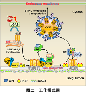 综上所述,该研究发现:1)STING为什么需要离开及如何离开高尔基体(后高尔基体转运(post-Golgi trafficking))的分子机制(图二);2)一个功能未知蛋白ARMH3(可能还具有GEF活性,激活膜泡转运中非常重要的Small GTPase Arf1)在cGAS-STING通路中的重要作用;3)脂膜环境对STING的活化十分关键;4)细胞内PI4P水平的异常升高可以导致非依赖于cGAS的STING分子自激活(cGAS-independent STING autoactivation)。重要的是,这种现象在很多脂质代谢紊乱的自身免疫病患者中被发现及报道。鉴于PI4P在脂质运输及脂质稳态维持中的核心作用,他们的研究还提示STING作为一个潜在的细胞脂质稳态感受器(lipid homeostasis sensor),可能是细胞内的一种新型危险信号感受器。