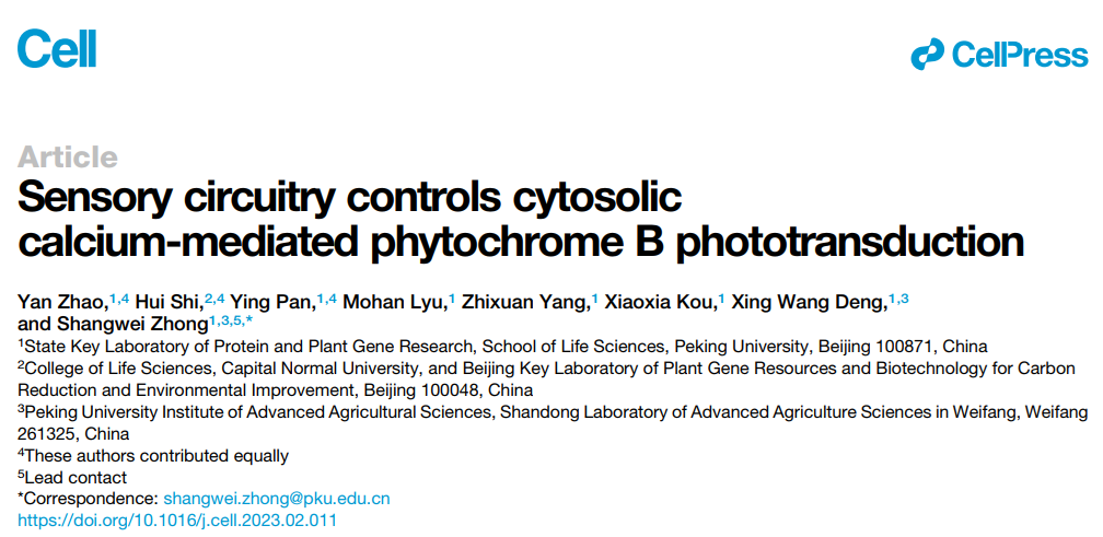 2023年3月16日,PA视讯游戏平台官网钟上威实验室在Cell期刊发表了题为“Sensory circuitry controls cytosolic calcium-mediated phytochrome B phototransduction”的研究论文,报道植物通过“光-钙调控环路”,快速激活两个钙依赖性蛋白激酶,在Ser80和Ser106位点磷酸化phyB,控制phyB入核。该工作同时提出了胞质第二信号钙离子在受体层面解码为特定转导通路的新机制。