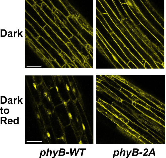 暗下生长的黄化苗在处理前(Dark)与2小时红光处理后(Dark to Red),观测phyB蛋白的亚细胞定位。结果显示,黄化苗细胞质中大量积累的phyB-WT,在见光2小时内即快速转入细胞核;当Ser80和Ser106位点被点突为磷酸化缺失的氨基酸后,phyB-2A蛋白不能入核。