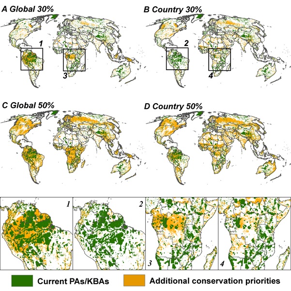 图1. 全球和国家情景、30%和50%保护目标下的现有保护地(PAs)、生物多样性关键区(KBAs)和有待增加的保护优先区。