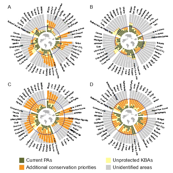 图2. 全球和国家情景、30%和50%保护目标下的现有保护地(PAs)、未被保护的生物多样性关键区(KBAs)、有待增加的保护优先区和无需保护的地区的面积百分比。此图只显示了各大陆上土地面积>30,000平方千米、目标百分比最高和最低的5个国家。少数国家在国家情景下的保护目标超过30%(B)或50%(D),以满足其他要求(如生态系统代表性)。