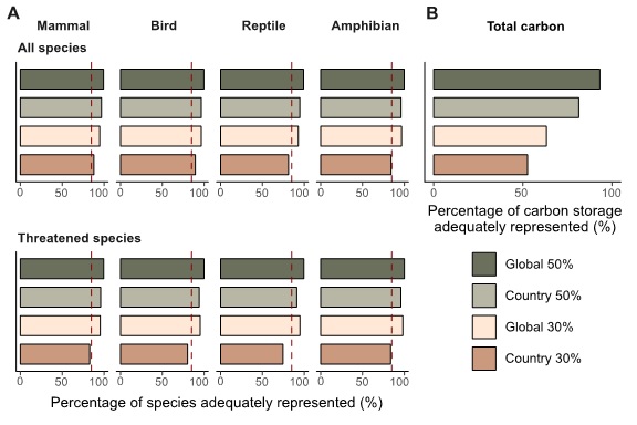 将保护优先区扩大到全球土地的50%,将满足几乎所有物种得到有效保护的面积需求,并保护全球大部分的碳储量(图3)。总体而言,在全球范围内协调各国的保护投入以统筹保护生物多样性和碳具有全球重要性的地区,而非各国保护其境内的30%或50%,可以极大的提高生物多样性和碳保护的效率。