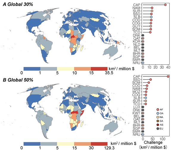 图4. 全球情景、30%和50%保护目标下各国的保护挑战。保护挑战等于国家范围内的优先保护区面积与按购买力平价(GDP PPP)调整的国内生产总值的比值。具有相似面积的优先区的国家,如刚果民主共和国和印度尼西亚、蒙古和南非,以及玻利维亚和印度,由于经济水平的差异,其面临的保护挑战可能差异巨大。