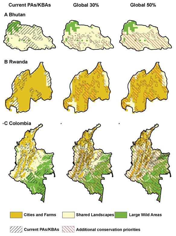 图5. 全球情景、30%和50%保护目标下,保护优先区在不同分区的分布。不丹的保护优先区主要位于C2(共享景观);卢旺达的保护优先区主要位于C1(城市和农田);哥伦比亚的保护优先区分布在C1至C3(大面积荒野)。这些例子突出了在全球情景和各国可能面临的不同情况下,为实现保护目标而平衡保护和社会经济发展的挑战。