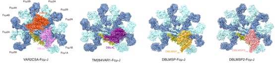 图1. 四种恶性疟原虫蛋白与IgM核心区形成复合体的冷冻电镜结构。