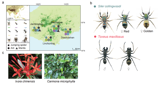 2023年5月17日,PA视讯游戏平台官网、蛋白质与植物基因研究国家重点实验室、北大-清华生命科学联合中心张蔚课题组,在iScience上发表了题为“Imperfect ant mimicry contributes to local adaptation in a jumping spider”的研究论文。该研究聚焦体色艳丽的跳蛛科翠蛛属科氏翠蛛(Siler collingwoodi),通过对其与同域分布的跳蛛及蚂蚁的运动及体色特征进行定量检测分析(图1),证明了科氏翠蛛存在不完美的蚂蚁拟态;行为学实验结果揭示了科氏翠蛛的不完美拟态对其适应环境的重要意义。