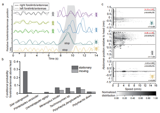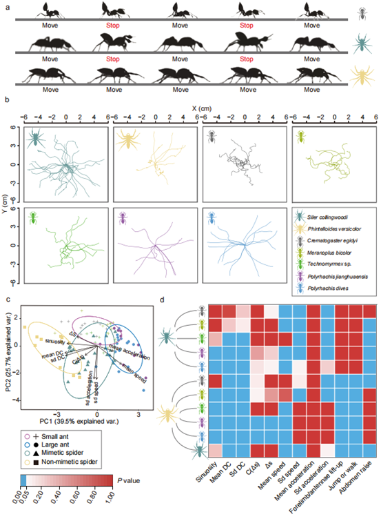 图3. 科氏翠蛛及同域分布的蚂蚁、非拟态跳蛛的步态分析