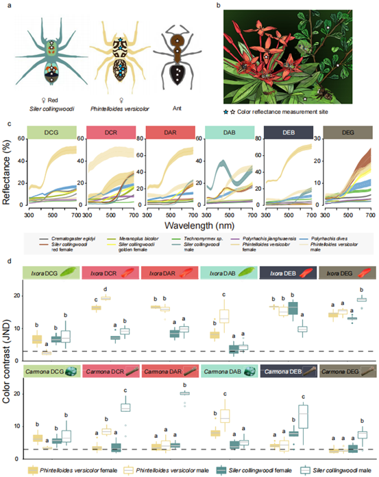 图4. 蜘蛛和蚂蚁的反射光谱以及在跳蛛的视觉模型下蜘蛛与其主要寄主植物的颜色对比